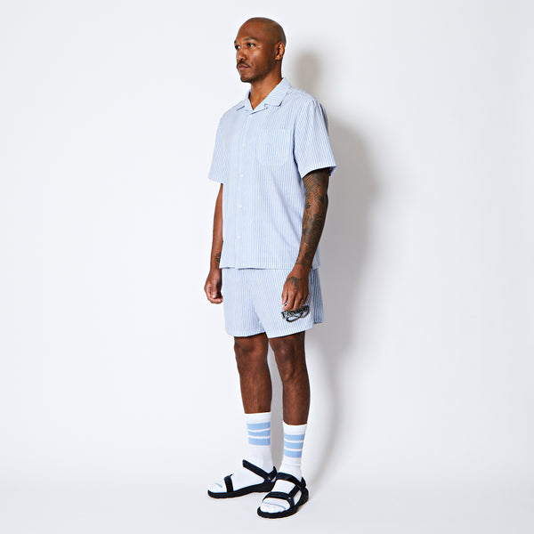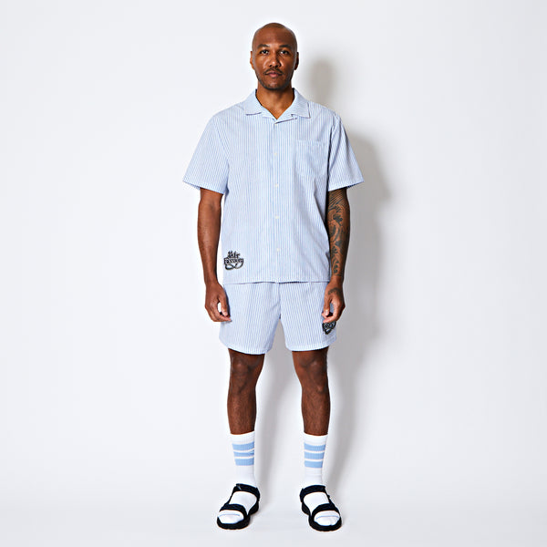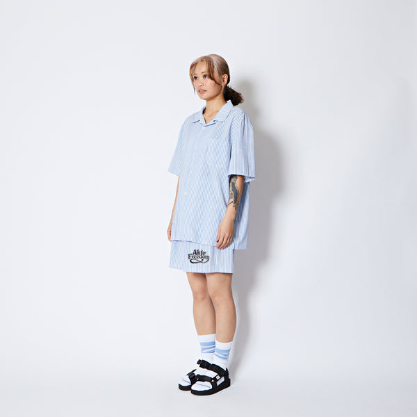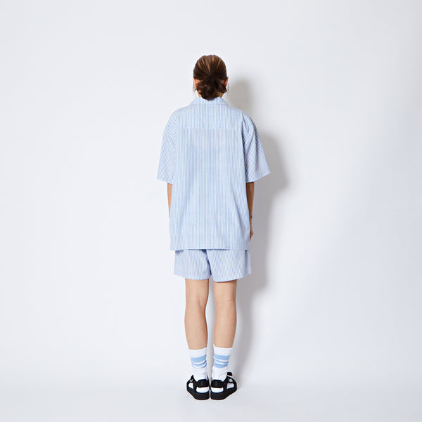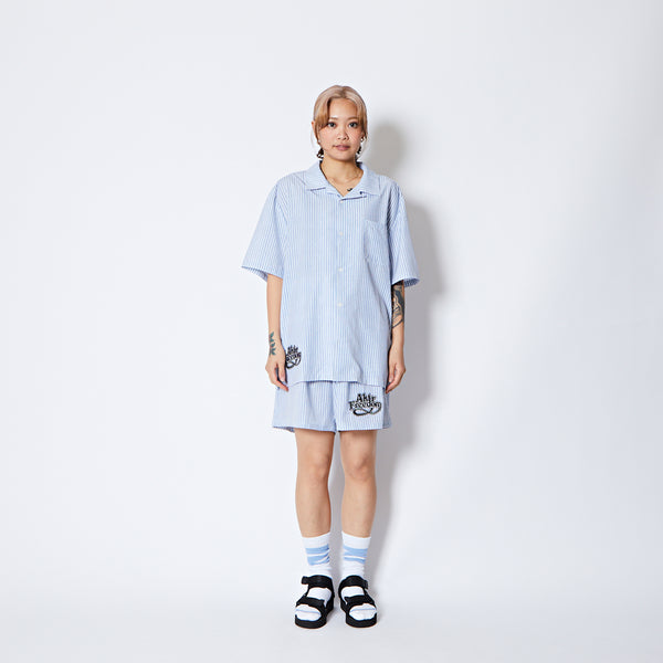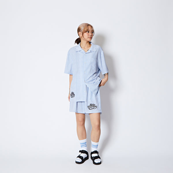 design:60年代のカウンターカルチャーから続く、自由を求める空気感をデザインしたサマーコレクション。爽やかなストライプ柄が特徴のオープンカラーの半袖シャツ。レトロなスポーティーテイストのロゴを裾に配置。程よくルーズなシルエットでストレス無く着用可能。