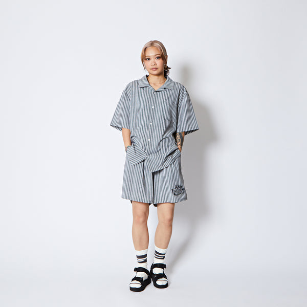 design:60年代のカウンターカルチャーから続く、自由を求める空気感をデザインしたサマーコレクション。爽やかなストライプ柄が特徴のオープンカラーの半袖シャツ。レトロなスポーティーテイストのロゴを裾に配置。程よくルーズなシルエットでストレス無く着用可能。