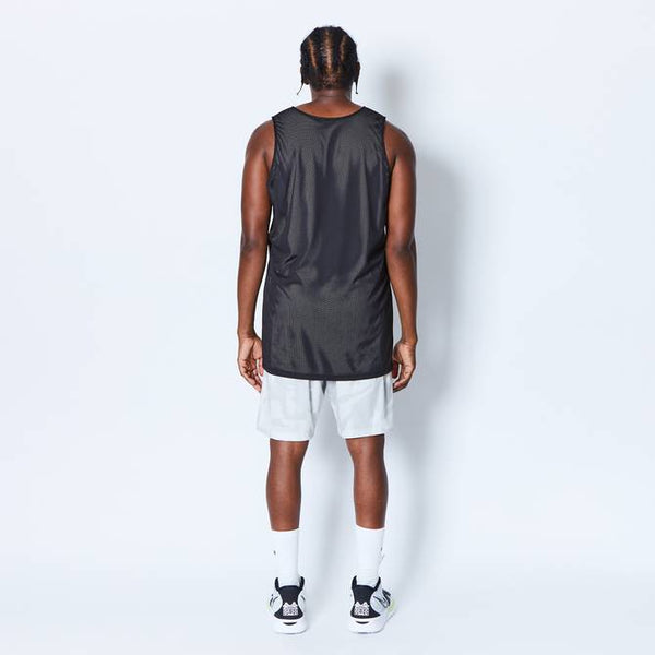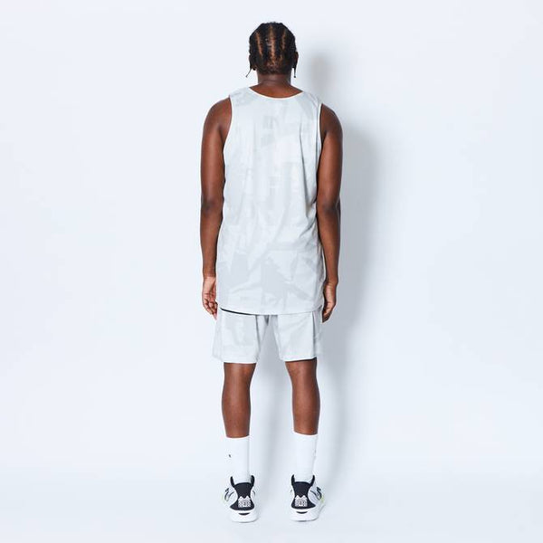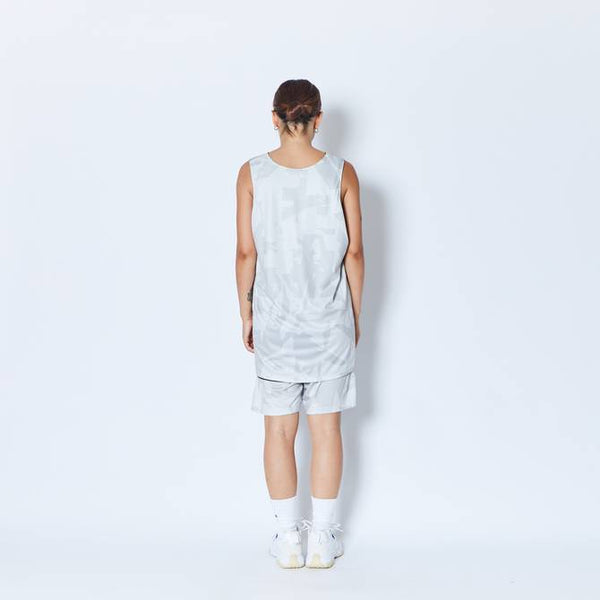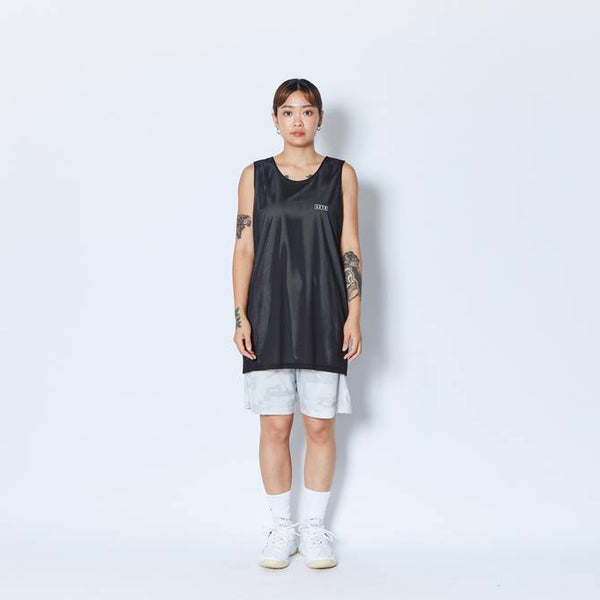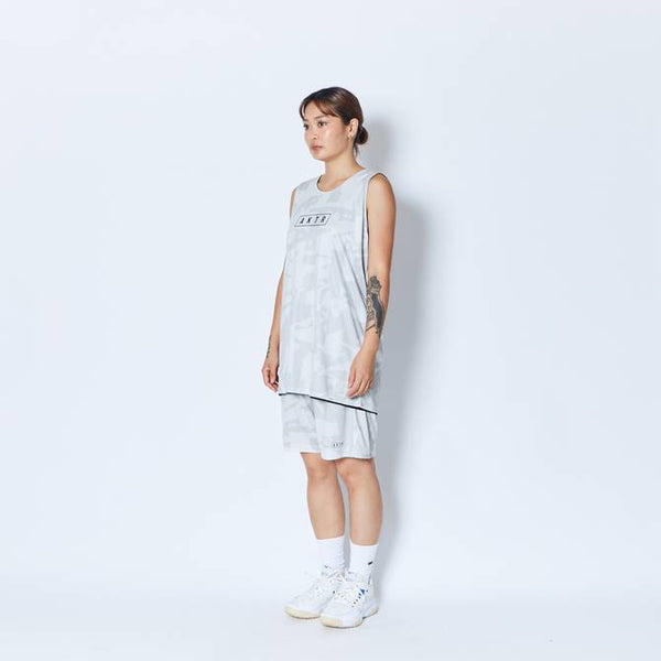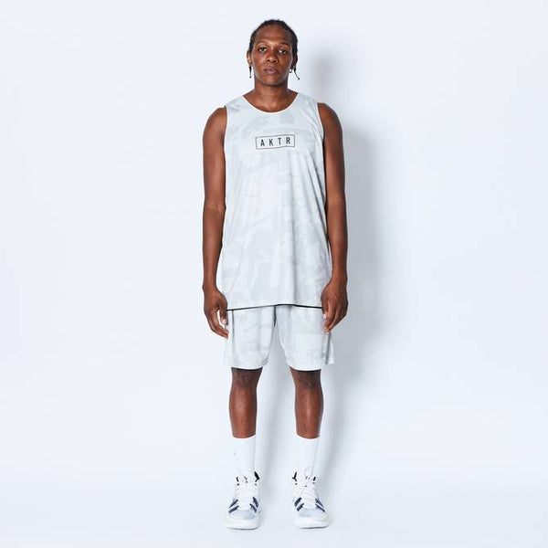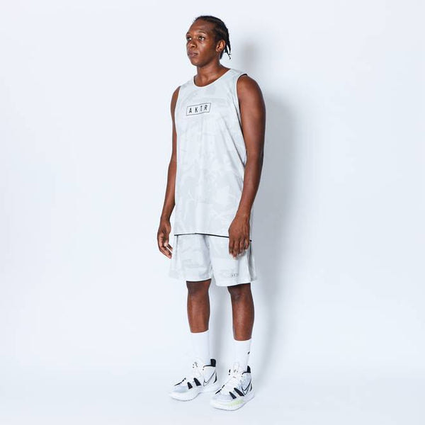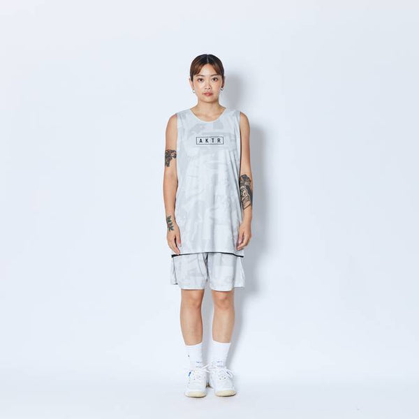 design:AKTRがシーズン毎にアップデートする総柄シリーズのリバーシブルタンクトップ。バスケットボールの写真を切り刻んで再構築したデザインをカモフラージュ柄で表現。総柄の面を裏返すと、胸にワンポイントのロゴをプリントしたシンプルなタンクトップに早変わり。その時の気分によって使い分けることが出来、試合のチーム分けの際にも大活躍。