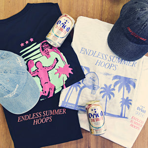 ビーチ沿いのローカルなバスケットボールコートの美しいサンセットと終わらない夏のピックアップゲームをイメージした "ENDLESS SUMMER HOOPS"のタグラインを配し、イラストを描き起こしたスポーツTEEと普段も着やすいフォトデザインのコットンTEE、ウォッシュ加工されたデニムキャップのラインナップとなります。